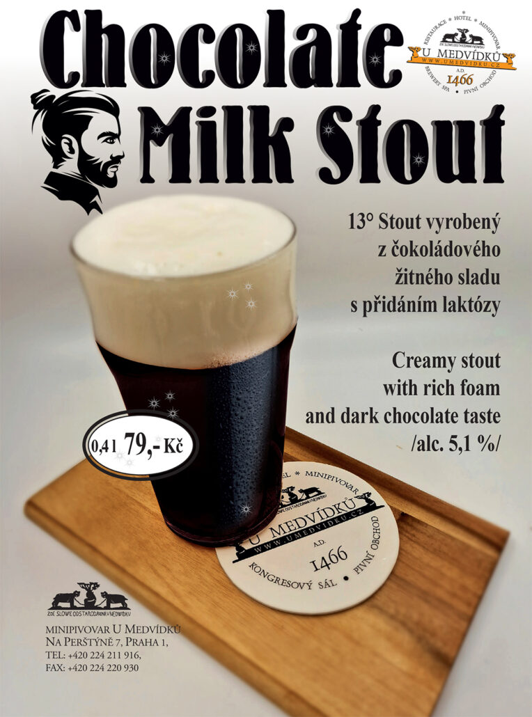 Chocolate Milk Stout – 31.12.2025od 31.12.2025 | from 31.12.2025 13° Stout vyrobený z čokoládového žitného sladu s přidáním laktózy. Creamy stout with rich foam and dark chocolate taste. /alc. 5,1 %/ https://umedvidku.cz/wp-content/uploads/2018/06/Chocolate-Milk-Stou2025.jpg 1400 1038 hotelumedvidku https://umedvidku.cz/wp-content/uploads/2019/10/logo-hotel-umedvidku.png hotelumedvidku2025-12-20 12:15:492026-04-20 12:18:00Chocolate Milk Stout – 31.12.2025